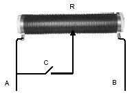 A figura representa de forma esquemática as ligações de um chuveiro elétrico, onde C é uma chave que quando ligada, coloca em curto circuito uma parte da resistência. Entre os terminais A e B está aplicada uma tensão de 120 V. Com a chave C aberta a potência dissipada para aquecimento da água é 2.400 W. Qual o valor da resistência R em ohms?