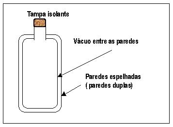 Condução - evitada pelo vácuo entre as paredes duplas e pela tampa isolante.