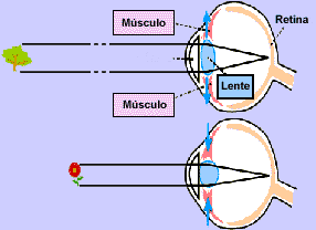 Veja como funciona o cristalino. Quando olhamos coisas distantes ele é puxado por pequenos músculos e fica com um formato bem achatado. As setas no desenho mostram o sentido em que ele é puxado. Quando olhamos coisas bem próximas, os músculos empurram o cristalino e ele fica bem arredondado. A idéia é manter tudo em foco 3/4 luz bem em cima da retina.